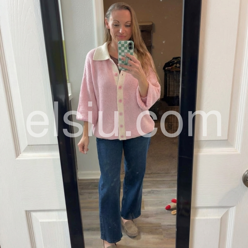 This sweet pink collared long sleeve cardigan is the perfect addition to any wardrobe. Made from high-quality materials, it offers both comfort and style. Its versatile design allows for easy pairing with any outfit, making it a must-have for any fashion enthusiast. Embrace comfort and sophistication with this cozy sweater.