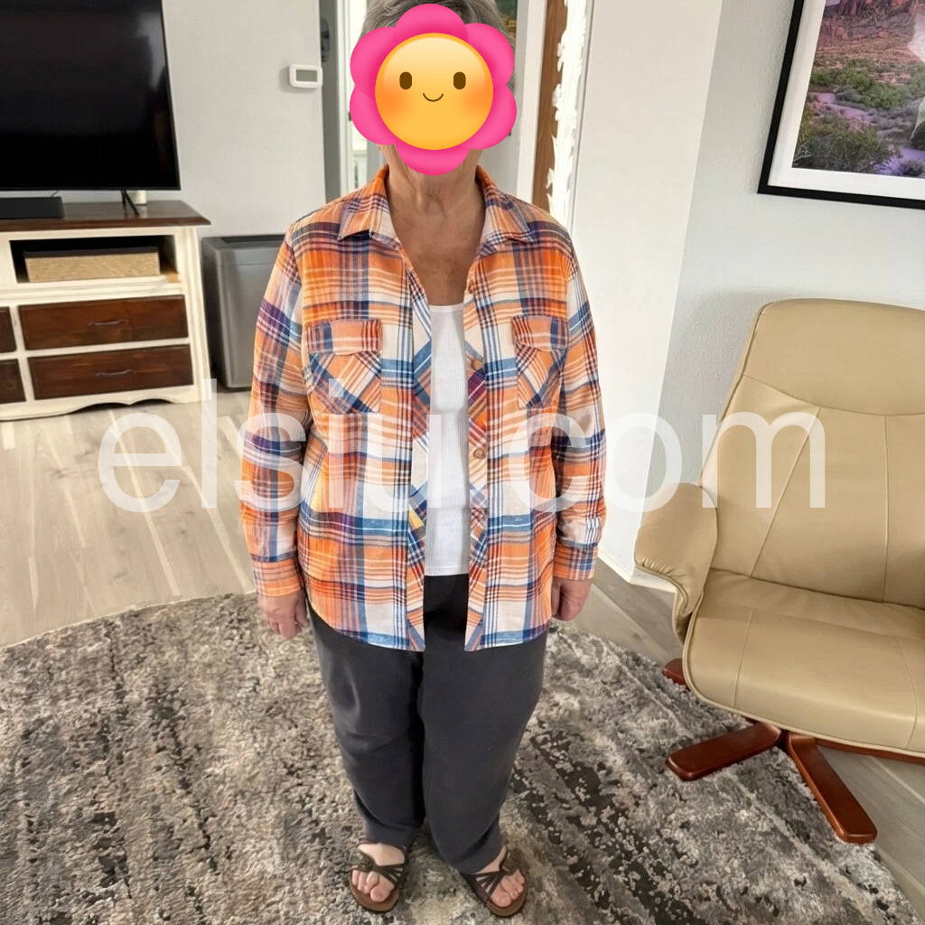 Wear this classic plaid print top to game day, a casual day or night out, and more with its laid-back vibe. A bright orange and blue all-over plaid print with buttons down the front, a fold-over collar, and long sleeves make it great for layering with a t-shirt or camisole underneath, jeans, or leggings.