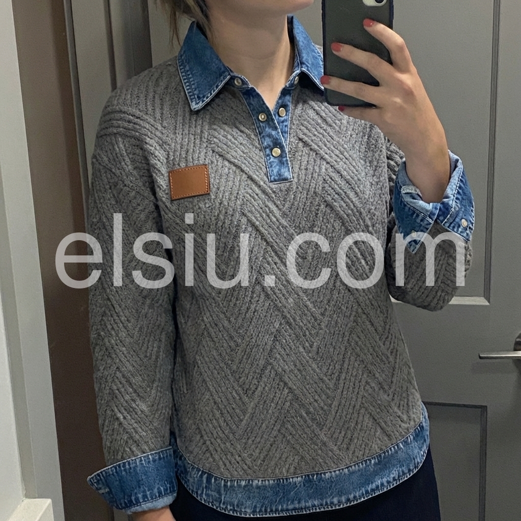 Elevate your casual wardrobe with this sophisticated grey herringbone knit sweater, featuring a distinctive denim collar that bridges the gap between refined knitwear and relaxed styling. The herringbone texture adds visual depth and dimension, while the contrasting denim collar provides a contemporary edge perfect for layering or wearing standalone. Crafted for versatility, this piece transitions seamlessly from weekend wear to smart-casual settings, offering both comfort and polished appeal.