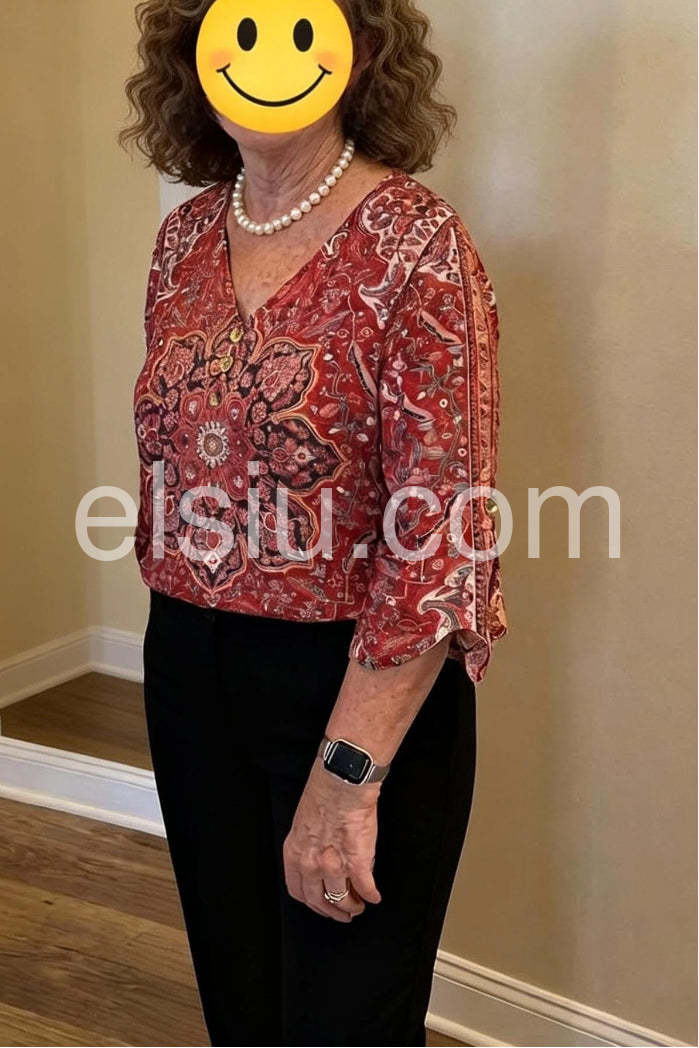 A vibrant bohemian blouse featuring an intricate red paisley print. This elegant top showcases a classic V-neckline adorned with delicate buttons, adding a touch of sophistication. The three-quarter length flared sleeves create a flowy, feminine silhouette, perfect for both casual outings and more dressed-up occasions. Crafted from lightweight, breathable fabric, it ensures comfort all day long.