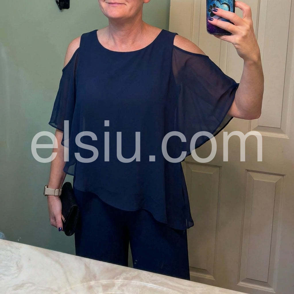 This fashionable two-piece set includes a navy cold shoulder three-quarter length draped sleeves and asymmetrically layered ruffled top and pants. Crafted from lightweight and soft materials, this set is perfect for any occasion. Step up your look with this stylish set.