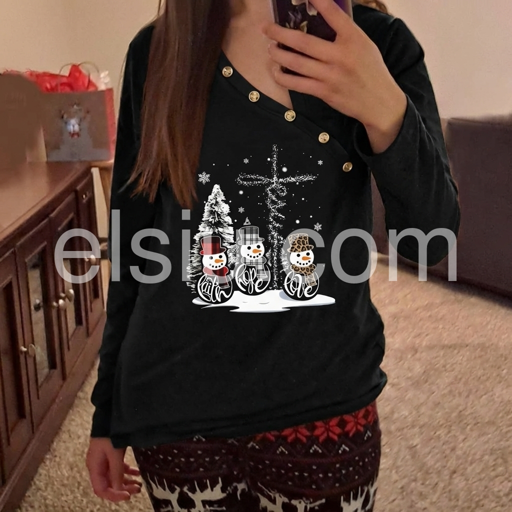Add this cozy long sleeve top to your winter wardrobe, featuring adorable snowmen and a Cross, a Christmas tree, and falling snowflakes that set the stage for a super-fun holiday party, Christmas vacation, and so much more. An asymmetrical button front collar gives it a contemporary vibe.