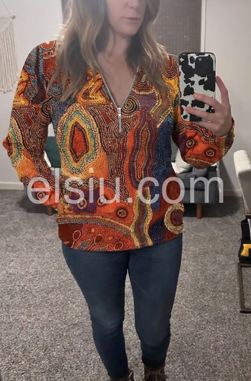 Autumn Aztec Geometric Zippered Long Sleeve Top