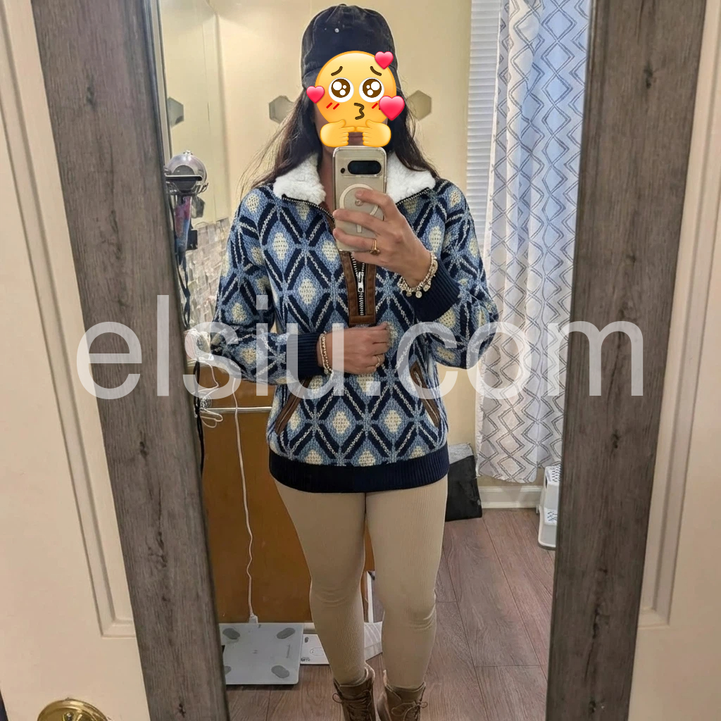 Elevate your cold-weather wardrobe with this sophisticated knit sweater, featuring a striking blue geometric pattern that adds visual interest to any ensemble. The fleece lining provides exceptional warmth and comfort, making it an ideal choice for layering or standalone wear during transitional seasons. Crafted from quality knit fabric, this piece combines contemporary design with practical functionality. The geometric detailing brings modern flair while maintaining versatility—pair it effortlessly with jeans, trousers, or skirts for polished everyday styling.